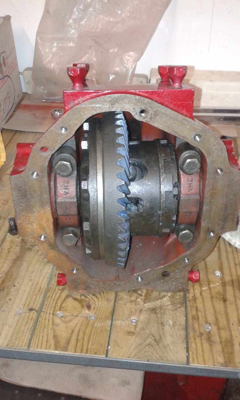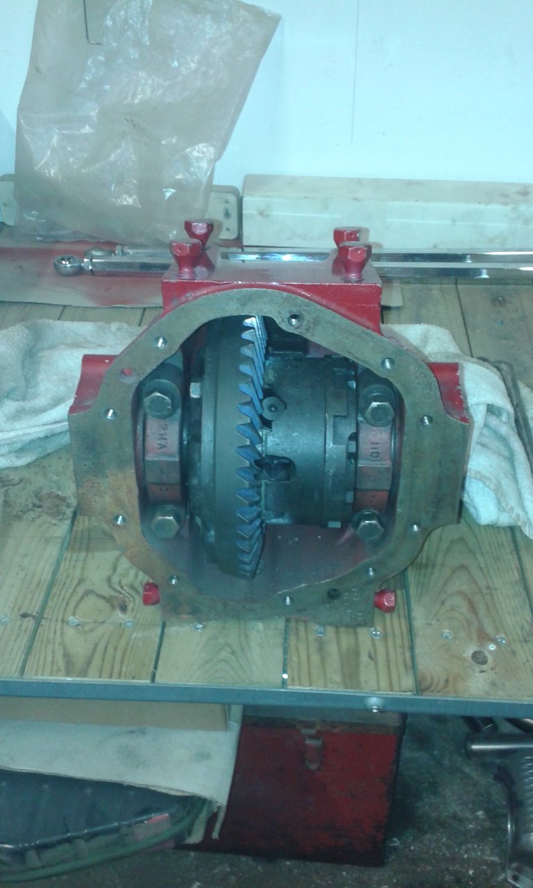 the longer bolts arrived for the ring gear this morning so this afternoon we got the new bearings pressed onto the lsd and the new bolts torqued up. the axle's now fully rebuilt ready to go. we plan to loosely assemble the open jag diff into the jensen axle, but.... with the lsd needing a big lump of shims to get the ring gear close enough to mesh with the pinion this probably means the open diff would be 'too' close to the pinion to fit. to keep the pile of loose parts to a minimum we may just fit the diff with no ring gear so all the other parts are inside the axle.