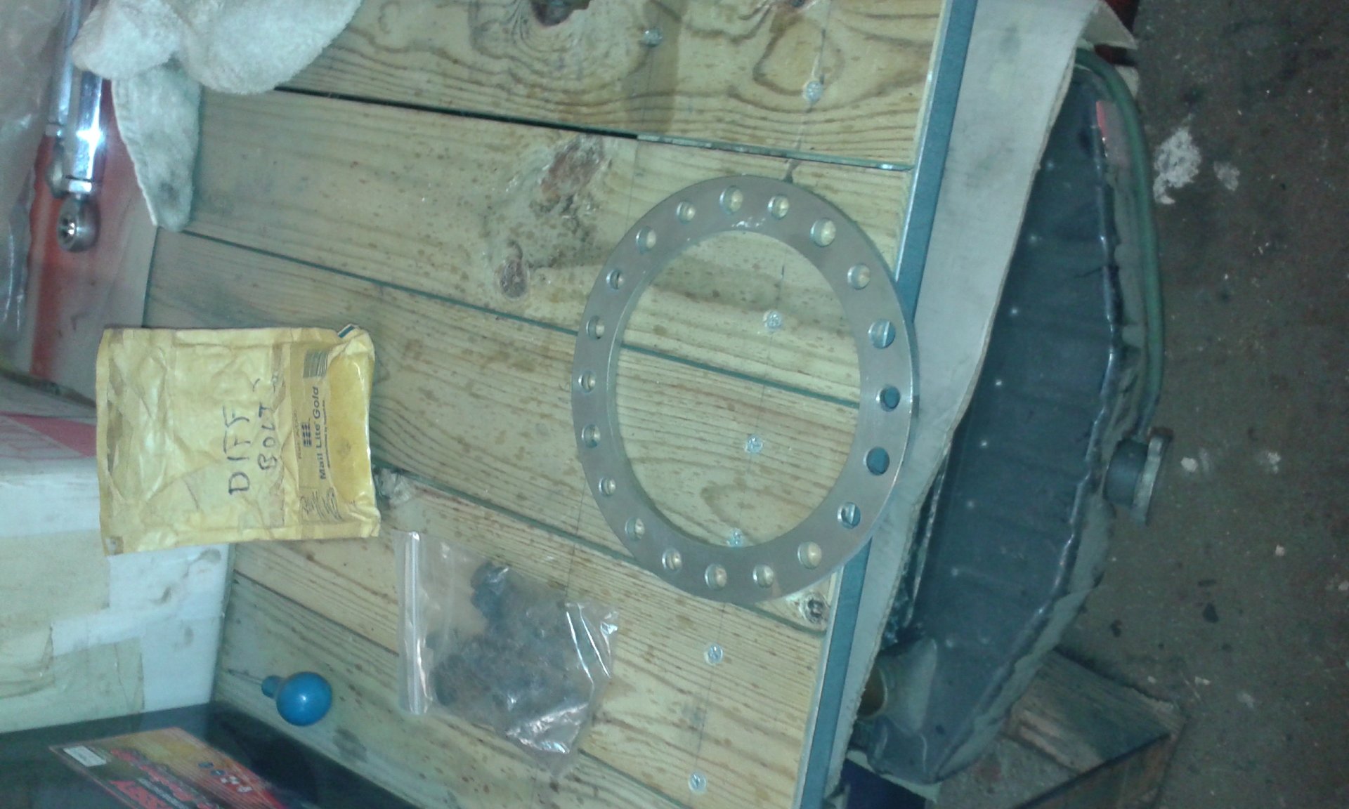 the new 'shims' for the ring gear are made and the bearing shims juggled side to side 'til the gear backlash is right. this was made easier as we'd flap wheeled the inside of 2 used bearings so they were a tight sliding fit on the diff allowing them to be removed and refitted while changing shims. we'll get the new bearings pressed on now we have the shim situation sorted. we ended up with 1x5mm and 2x1mm crown wheel shims (see pic) as that's what sheet i had to get me closest to the just under 7mm we needed. that's the reason for the bearing shim juggling as we'd got the bearing preload set with the required shims already. as soon as the longer ring gear bolts arrive we can get it all buttoned up. :thumbs_up_smiley: